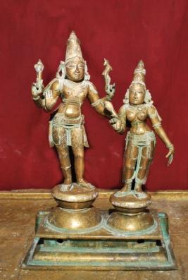 | Description / विवरण | Siva and Uma are standing on separate Padma peetams over a rectangular pedestal. Siva is with four hands. Upper hand carries an axe and deer. The lower right hand is in Abhaya mudra where as the left hand in Alingna poses with uma. Devi is standing by the left side of Siva with Tribhanga pose. Two hands. Right hand with a lotus flower and the left hand in lola hastha pose. Wearing karanda Makutam on the head. |