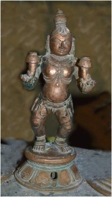 | Description / विवरण | Standing on padma peetam with two hands. With flowers. Channaviram is on the chest. Kesabhandam is the head dress. Waist hand with bell ornaments and nude inform. |