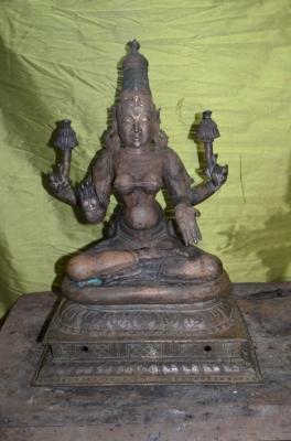 | Description / विवरण | Sitting on padma peetam with padmasana pose. Upper hand carry lotus flowers and the lower hands in Abhaya and Varadha postures. Wearing kirita makutam. |