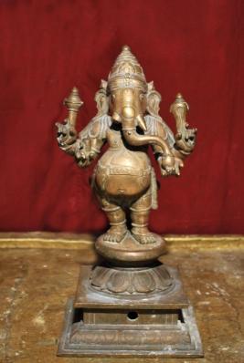 | Description / विवरण | Standing on padma peetam with four hands. Upper hands with Ankusa and Pasa. The lower right hand with broken tusk and left hand with fruit. Wearing Karanda Makuta on the head. |