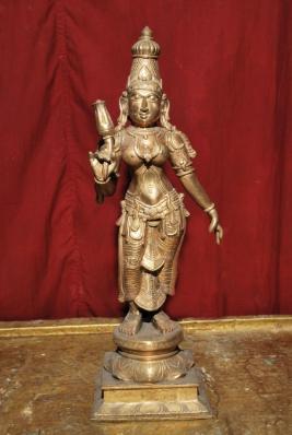 | Description / विवरण | Standing in Tribhanga style on a padma peetam with two hands. Right hand holding a flower and the left hand in lola hastha posture. Wearing jata Makutam on the head. |