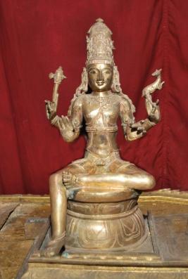 | Description / विवरण | Siva sitting on padma peetam with usual features. The left leg is folded and the right leg hanging down. Having four hands. Upper hands carry Angusa and a deer. The lower hands are with Abaya and Kataka mudra postures. Wearing Kirita Makutam. |