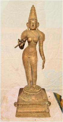 | Description / विवरण | Standing on padma peetam with Tribhanga pose. Two hands. Right hand with flower and left hand in lolahastha pose. Karata makutam is on the head. Two rings are found on either side of the square pedestal. Kujabhandam is absent.. |
