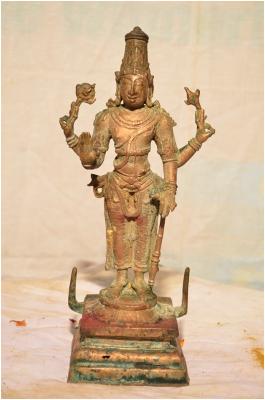 | Description / विवरण | Standing on padma peetam with four hands. Upper hands with chakra and conch. Lower right hand in Abhaya pose and lower left hand place on Gada. Kirita makutam is on the head. The waist dress is with a ring shaped decoration on either side. |