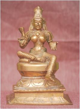 | Description / विवरण | Devi sitting on padma peetam . Her right leg folded and rests on a Thindu. Right leg in hanging position. Two hands. Right hand carry a lotus flower and the left hand in Varadha mudra. Wearing Kirita Mautam. |