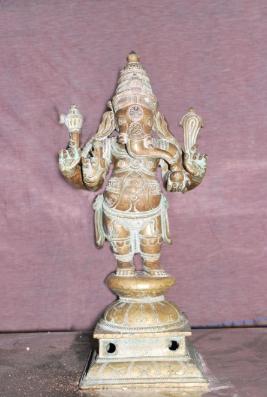 | Description / विवरण | Standing on Padma peetam with four hands. Upper hands carry Abkusam and pasam. Lower hands carry broken Tusk and fruit. Karanda Makuta on the head. |