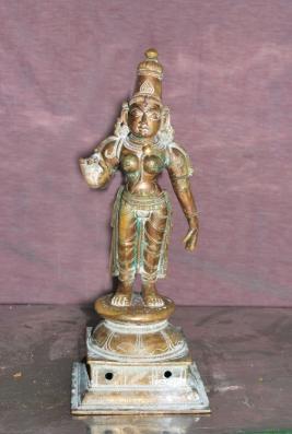 | Description / विवरण | Standing on padma peetam with two hands. Right hand in kataka mudra and left hand in lolahastha pose. Kirita makuta on the head. |