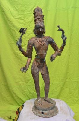 | Description / विवरण | Standing on padma peetam and the peetam is circular in shape. Having four hands. Upper hands carry an axe and a deer which faces the Lord. Lower left hand in a position of reclining on Rishabha and the right hand to carry a whip. Neck portion is decorated with ornaments. Waist dress is simple, elegant and extended up to thigh portion. Highly ornamented. Wearing jata makuta on the head. |