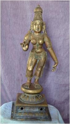 | Description / विवरण | Standing on padma peetam with two hands. Right hand with flower and left hand in lola hastha pose. Kujabhandam is absent. Kesa bhandam is the head dress. |