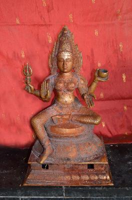 | Description / विवरण | Amman sitting on the padma peetam. Her right leg folded and the right leg in hanging position. Four hands. Upper hands carry Trisule and kapala. Lower hands show the Abhaya and Varadha mudras wearing Jwala makutam. |
