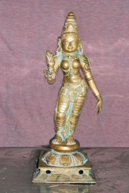 | Description / विवरण | Standing on padma peetam in tribhanga style. Two hands. Right hand has flower and left hand in lolahastha posture. |