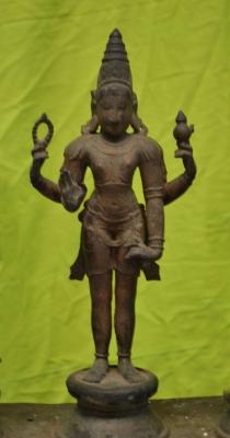 | Description / विवरण | Skandar standing on padma peetam over rectangular pedestal with four hands. Upper hands carry akshamala and kamandala Water pot Lower hands are with Abhaya and the other hand kept near the thigh. Wearing Makara kuntalam on the ears and karanta makutam on the head. |