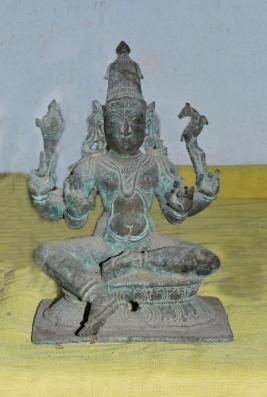 | Description / विवरण | Seated on padma peetam with left leg folded and right leg in hanging position. Four hands with usual features. Jata makutam on the head. |