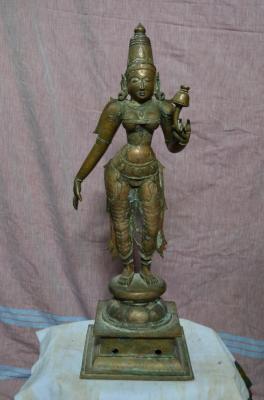 | Description / विवरण | Valli standing on padma peetam with two hands in Tribhanga posture. The left hand holding a flower and the right hand in lola hastha pose. Kujabhanda is present. Wearing kirita makutam on the head. The waist dress is extended up to the knee. |