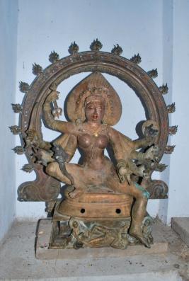 | Description / विवरण | Kali seated on padma peetam with right leg folded and left leg in hanging position. Eight hand. Right hands carry trisula, sword, flower and knife dagger . Left hands carry shield, kapala, bell and kapala. Circular shaped Tiruvesi with 17 flame decorations motifs. Head dress is significant and show workmanship. Skull is in 12 numbers kept as ornamental around the face. Head dress is with flame motify. The feet of devi asura is recling on the ground and catched his head and feet by her attendants. |