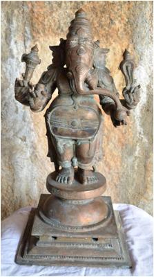 | Description / विवरण | Standing on the padma peetam in sama bhanga pose with four hands. Upper hands carry Ankusa and Pasa. Lower hands are with a broken tusk and holding a fruit. Wearing karanta makutam on the head. |