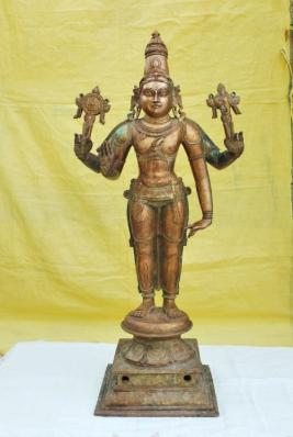 | Description / विवरण | Vishnu standing on padma peetam with four hands. Upper hands carry chakra and couch. Lower right hand in Abhaya pose and left hand rests on gada. Kirita makutam on the head. Lakshmi in the form of Triangle symbol is found on the right chest. |