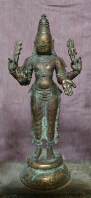 | Description / विवरण | Standing on padma peetam over the rectangular peetam. Having four hands. Upper hands carry Sakthi and Mazhu. Lower hands are in Abhaya and Varadha pose. Chinna vira on the chest. |