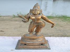 | Description / विवरण | Standing on Padma peetam in Tribhanga style. Two hands. Left holding a flower and the right in lola hastha posture. Lower garments. Wearing Karanda makutam. |