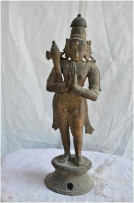 | Description / विवरण | Standing on padma peetam with two hands. An axe placed on his right shoulder. Kesa bhandam is the head dress. Makara kuntalam is on the ears. |