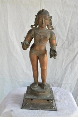 | Description / विवरण | Standing on padma peetam with two hands. The image is in child form. Right hand with pointing finger and the left hand carry a cup. Pathra kuntalam in the ears. Channa vira is in he chest. Waist band with bell garland. Nude, wearing no dress. |