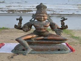 | Description / विवरण | Siva sitting on padma peetam. Left leg folded and the right leg in hanging position. Four hands. Upper hand carrys mazhu and deer. Lower hands are in Abhaya and varadha postures. |