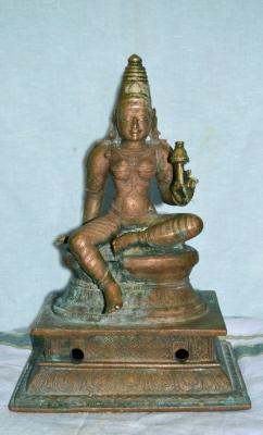 | Description / विवरण | Seated on padma peetam with left leg folded and the right leg in hanging position. Two hands. Left hand holds a flower and the right hand kept over the padma peetam. Kuja bhandam is present. Wearing karanta makutam on the head. |
