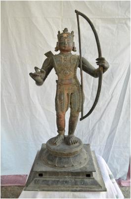| Description / विवरण | Standing on the adma peetam with two hands. Right hand in apposition to hold an arrow while the left hand with a bow. Wearing many ornaments on the chest. Waist dress is with leaf like arrangement. Wearing chapels in the feet. |