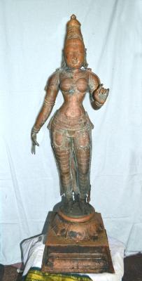 | Description / विवरण | Standing on padma peetam in Tribhanga posture with two hands. The left hand in kataka mutra and the right hand in lola hastha pose. Kujabhandam is present. Wearing jata makutam on the head. Waist band is highly ornamented and extended up to knee. |