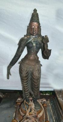 | Description / विवरण | Valli Standing on padma peetam with two hands. Left hand with a lotus flower and the right hand in lola hastha posture. Makara kuntalam in the ears. Wearing karanta makuta on the head. Kujabhandam is present. Waist band is decorated with ornamental work. |