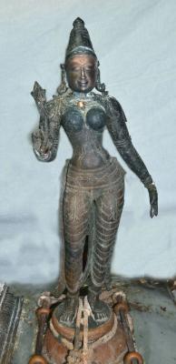 | Description / विवरण | Standing on padma peetam with two hands. Right hand with a flower and the left hand in lola hastha posture. Makara kuntalam in the ears. Karanta makuta on the head. Waist band is highly decorated and extended up to knee. Devoid of kujabhandam. |