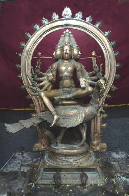 | Description / विवरण | Skanda sitting on peacock over a padma peetam. Five hands with weapons. Two hands are in Abhaya and Varadha pose. Having six faces. |