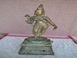 | Description / विवरण | Standing on padma peetam in Tribhanga style. Two hands. Right holding a flower and the left in lola hastha pose. Wearing karanda makuta. Lower garments. Exposed brest.Ornamented long ears. |