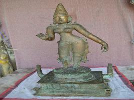 | Description / विवरण | Standing on padma peetam in Tribhanga style. Two hands are in Kataka and lola hastha poses. Wearing karanda makutam. Lower garments. |