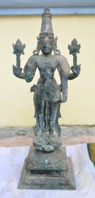 | Description / विवरण | Standing on the padma peetam in samabhanga posture with four hands. Upper hands carry Chakra and conch. Lower hands are in Abhaya and Katyavalampitha mutras. Makara kuntalam on the ears. Wearing Kirita makutam on the head. Dress from the waist up to the knee is with decorative design. |