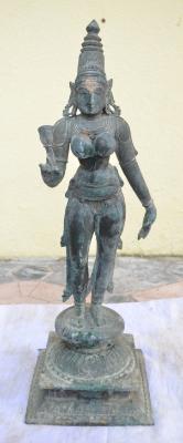 | Description / विवरण | Devi standing on the padma peetam in Tribhanga posture with two hands. The right hand holds a flower and the left hand in lola hastha pose. Makara kuntalam on the ears. Wearing karanta makuta on the head. Devoid of kujha bhandam. Dress from waist to the foot |