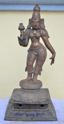 | Description / विवरण | Devi standing in Tribhanga pose with two hands on the padma peetam. Her right hand holds a flower while the left hand in lola hastha posture. Makara kuntalam adorns the ears. Wearing jata makutam on the head. Kujha bhandam is present. Dress is highly decorated at the waist portion and extended up to knee. |