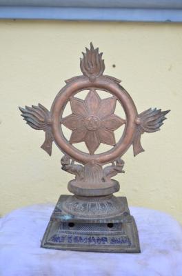 | Description / विवरण | Chakram fixed on padma peetam. Three flame motifs are found in the circle. The circle is supported by two lions on either side . At the centre of the chakra, a swastika design is embedded. |