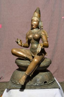 | Description / विवरण | Uma sitting on the padma peetam. Her right leg folded and the left leg in hanging position. Her two hands are in Abhaya and Kataka mutra poses. Devoid of kujha bhandam. Makara kuntalam on the ears. Wearing karanta makuta on the head. The image sitting facing Siva who used to be to her righted side.. |