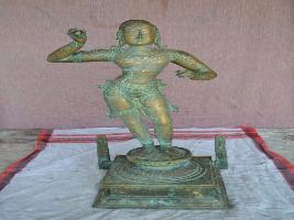 | Description / विवरण | Standing on padma peetam in Tribhanga style. Two hands in the posture of holding a Thumburu- a musical instrument- which is missing. Long ears with big holes. Significant dress- covers the body upto knee. |