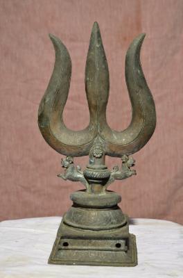 | Description / विवरण | Trisula is fixed on the padma peetam above the square pedestal. It is supported at the bottom side by two loin figures. |