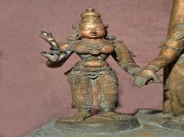 | Description / विवरण | Standing on pedestal with two hands. Right hand holds a flower while the left hand holds Lord siva s hand. Devoid of kujha bhandam. Kesa bhandam is the head dress. |