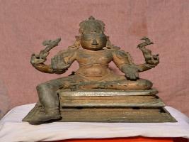 | Description / विवरण | Seated on padma peetam with left leg folded and the right leg in hanging position. Having four hands. Upper hands carry Mazhu and deer. Lower hands are in Abhaya and Varadha poses. Makara kuntalam on the ears. Wearing jata makutam on the head. |
