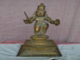 | Description / विवरण | Standing on the padma peetam in Tribhanga posture. Two hands having sword and a shield. Wearing Kirita makutam. |