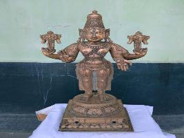 | Description / विवरण | Perumal standing on the padma peetam. Having four hands. Upper hand carrys Chakra and Chanku Conch The lower ahnds are in Abhaya and Varadha poses. Wearing Kirita makutam. Long ears with big holes. Lower garments. |