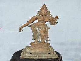 | Description / विवरण | Standing on the padma peetam in Tribhanga pose. Two hands. Left holding a flower and the right in lola hastha posture. Wearing karanda makutam. Long ears with big holes. Lower garments. |