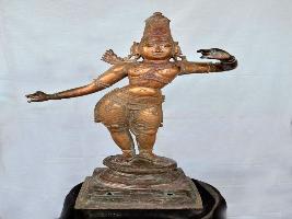 | Description / विवरण | Standing on padma peetam in tribhanga style. Two hands are in the posture of holding the bow. Bow is missing. Wearing kirita makutam. Lower garments. A basket carrying arrows tied to the back of his right shoulder. |