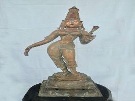 | Description / विवरण | Standing on padma peetam in Tribhanga style with two hands. Left holding a flower and right in lola hastha pose. Wearing Jata makutam. Lower garments. |