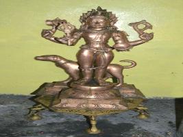| Description / विवरण | Standing on padma peetam with four hands. Upper hands with Damaru and Pasam. Lower hands with Trisule and kapela. Nude in form. Skull garland runs from the shoulder to feet. Head dress with five motifs. The vahana stands back at the feet in a separate pedestal. The waist band is a snake and nude in form.. |