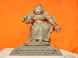 | Description / विवरण | Standing on padma peetam in Tribhanga posture with two hands. The right hand holding a flower and the left hand in lola hastha pose. Devoid of Kujha bhandam. Wearing karanta makutam on the head. Waist band is decorative and the edge of dress with intricate carvings. |